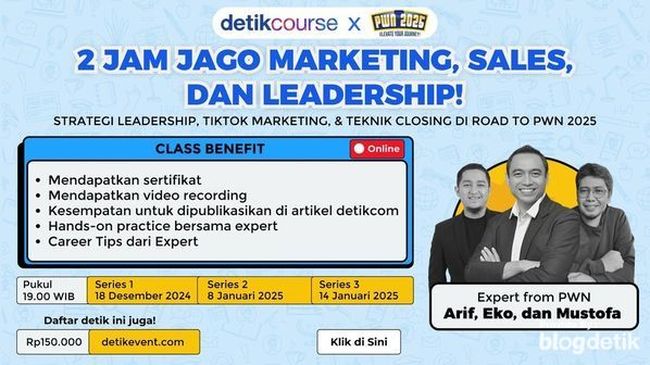 Kelas inspiratif kolaborasi antara detikCourse dan PWN sukses digelar pada pada 8 Januari 2025 lalu. Kelas ini mengangkat tema '10 Rahasia Bisnis Bertumbuh Dalam Situasi Apapun.' Dibimbing langsung oleh Coach Erry, kelas ini berhasil menarik perhatian banyak peserta yang antusias mendalami strategi bisnis yang terbukti efektif di berbagai kondisi.