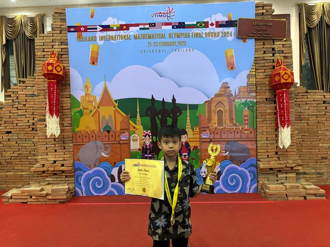 Siswa kelas 1 SD dari Sekolah Kharisma Bangsa, Tangerang Selatan, Ragnar Azhar Saddiq Lasabuda, kembali menorehkan prestasi di ajang olimpiade matematika internasional. Terbaru, Ragnar berhasil meraih medali emas di Final Thailand International Mathematical Olympiad (TIMO) 2024-2025.