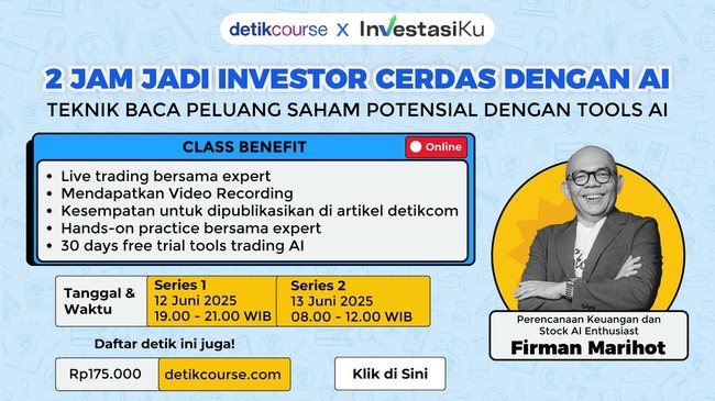 Sekarang kesempatan ini bisa kamu pelajari langsung lewat kelas detikcourse X Investasiku, Trading bareng FITSTOCK AI, yang akan digelar pada Rabu, 27 Agustus 2025 di Gedung Menara Bank Mega, Jakarta Selatan.