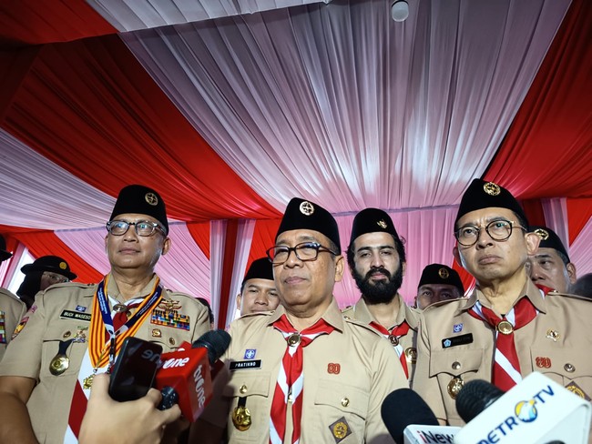 Menteri Koordinator Bidang Pembangunan Manusia dan Kebudayaan (Menko PMK), Praktikno, berpesan kepada para anggota Pramuka pada upacara Hari Pramuka ke-64 di Bumi Perkemahan Cibubur, Jakarta, Kamis (14/8/2025). Menjadi garda terdepan menghadapi disrupsi teknologi.