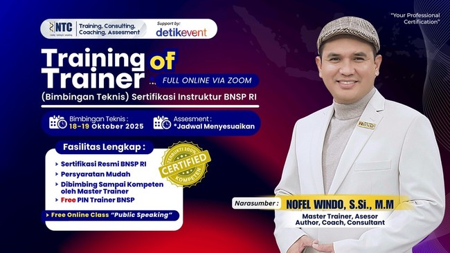Tiket kelas ini telah tersedia di detikevent dengan promo early bird seharga Rp2.500.000. Dengan membeli tiket tersebut, Anda akan dapatkan bimbingan menyeluruh secara langsung dari Master Trainer profesional dan kesempatan lulus 100% ujian sertifikasi instruktur level 4 BNSP RI.