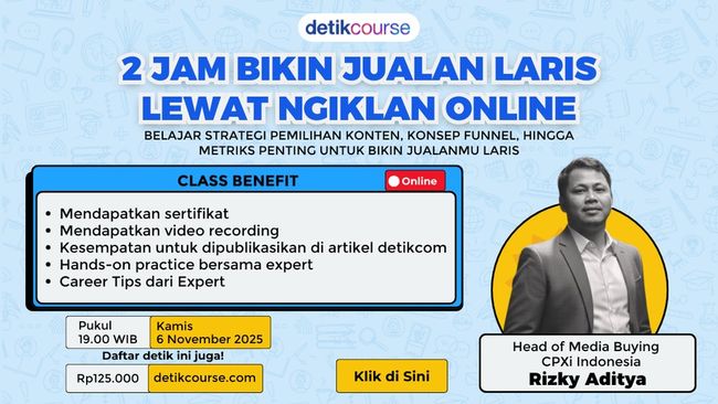 Jangan tunggu sampai bujet iklanmu terbuang sia-sia. Saatnya kamu jago ngiklan online dan bikin penjualan bisnis makin melejit! Segera daftar kelas detikcourse 2 Jam Bikin Jualan Laris Lewat Ngiklan Online sekarang juga hanya di detikevent.