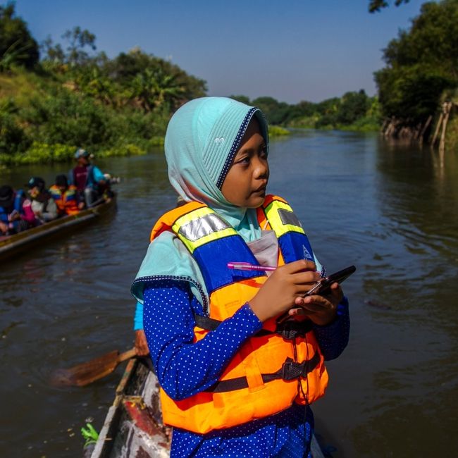 Remaja yang akrab disapa Nina ini pernah melakukan susur Sungai Brantas pada 03 Juli 2021 bersama Ecoton. Organisasi ini digagas oleh kedua orang tua Nina, Prigi Arisandi dan Daru Setyo Rini sejak tahun 2000. (Foto: Dok. Pribadi Aeshnina)