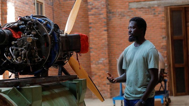 Seniman Ghana, Ibrahim Mahama (35), memeriksa mesin baling-baling pesawat di fasilitas studionya di Tamale, Ghana, Jumat, (15/7/2022). Mahama membeli pesawat bekas untuk menambah koleksi di Red Clay Studio. Studio tersebut merupakan sebuah kompleks yang berfungsi sebagai pusat pendidikan terbuka bagi warga Jenakpeng, Ghana.