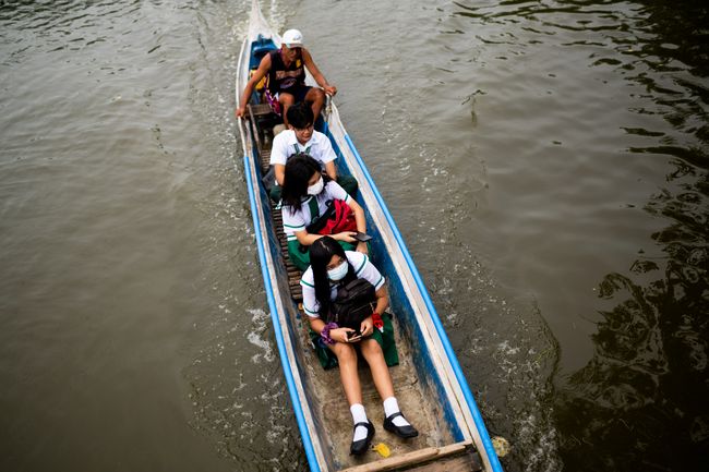 Sejumlah siswa menaiki perahu untuk berangkat ke sekolah pada hari pertama kelas tatap muka, di Macabebe, Pampanga, Filipina, Senin (22/8/2022).