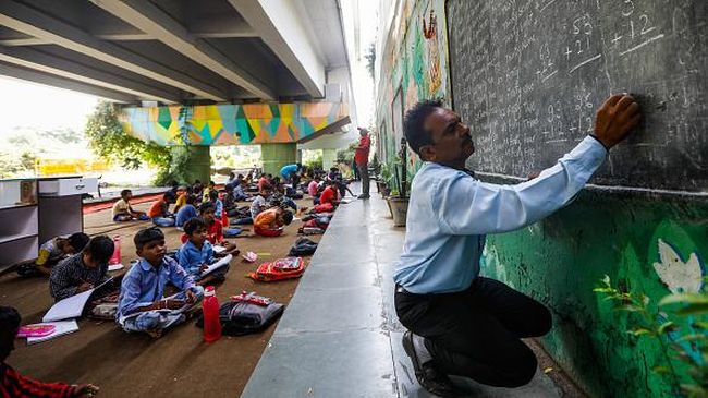 India - Hari Guru Sedunia diperingati untuk menghargai jasa para guru. Salah satunya guru di India ini, ia membangun sekolah di kolong jembatan untuk anak-anak miskin.