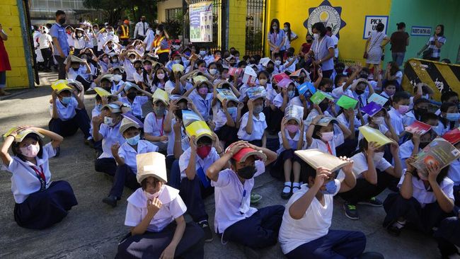 Filipina - Siswa SD Filipina melakukan latihan gempa nasional kuartal ketiga. Hal itu dilakukan untuk membuat publik mengetahui protokol dan tanggapan selama bencana.