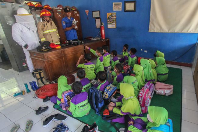 Ungaran - Anak-anak sekolah TK mengikuti latihan pemadaman kebakaran, di Ungaran, Jawa Tengah, Jum'at (23/9/2022). Tingkahnya bikin gemas! Lihat nih.