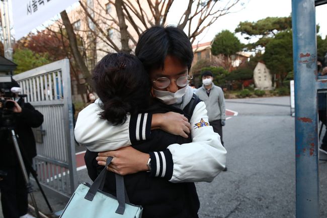 Seorang ibu memeluk putranya yang mengikuti College Scholastic Ability Test (CSAT) atau Suneung pada 17 November 2022 di Seoul, Korsel. Suneung adalah acara akademik tahunan paling penting di Korsel. Tes ini bisa membuat kegiatan di seluruh negeri terhenti. Tak hanya pelajar, orang tua pun ikut gugup menghadapi Suneung. Foto: Getty Images/Chung Sung-Jun