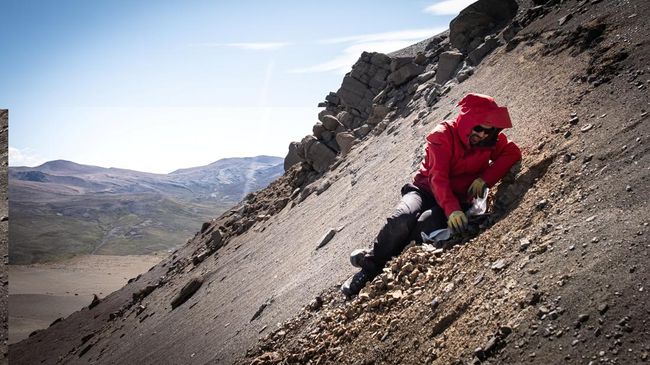 Seorang arkeolog menggali fosil megaraptor di bukit Guido, daerah Patagonia, Chile, Senin (16/1/2023).