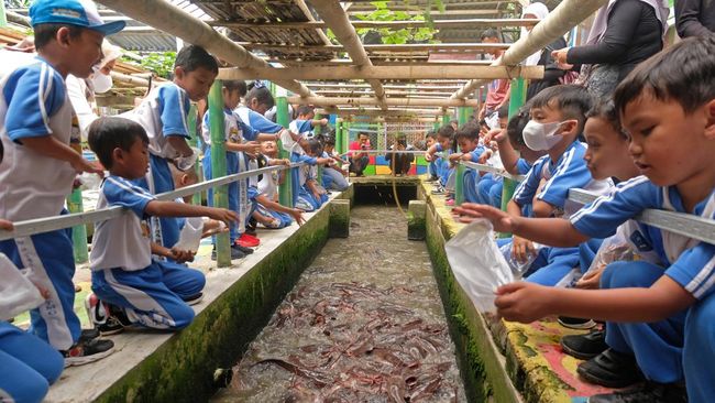 Sejumlah pelajar TK (taman kanak-kanak) memberi pakan ikan lele di kolam kompleks Argo Eduwisata Putat, Kedu, Temanggung, Jawa Tengah, Selasa (17/1/2023). Kegiatan belajar di luar ruang ini diikuti oleh puluhan siswa TK.