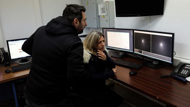 Astronom dan peneliti senior Observatorium Nasional Athena Alkisti Bonanos berbicara dengan rekan-rekannya saat mereka menyaksikan gambar komet hijau bernama Comet C/2022 E3 (ZTF) yang diambil dari teleskop observatorium Kryoneri, di Kryoneri, Yunani, Rabu (1/2/2023) waktu setempat. (Reuters/Alkis Konstantinidis)