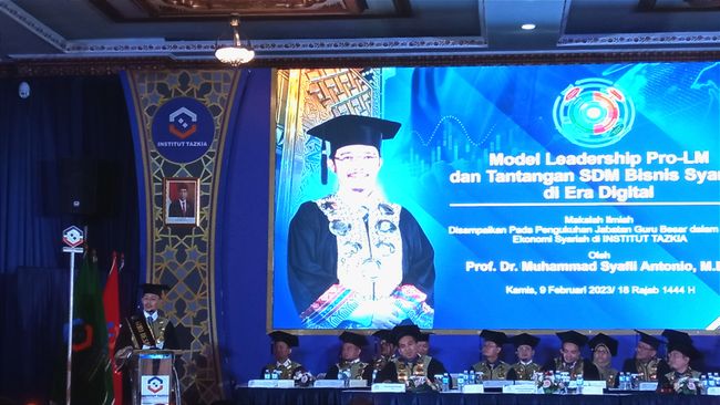 Jakarta - Prof Syafi'i Antonio dikukuhkan menjadi Guru Besar Ilmu Ekonomi Islam di Institut Tazkia Bogor. Acara ini dihadiri juga oleh Menteri Perdagangan.