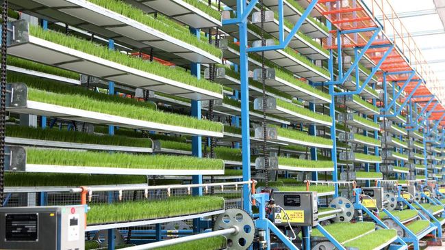 Ini adalah rumah kaca di pabrik pintar pembibitan padi di Chongqing, China. Rumah kaca ini luasnya 4.608 meter persegi, minim lahan untuk ukuran budidaya padi konvensional. Namun setahun dapat menanam bibit padi setara luasan 12.000 mu atau 8.000.000 m2 setara 800 hektar. CFOTO/Getty Images
