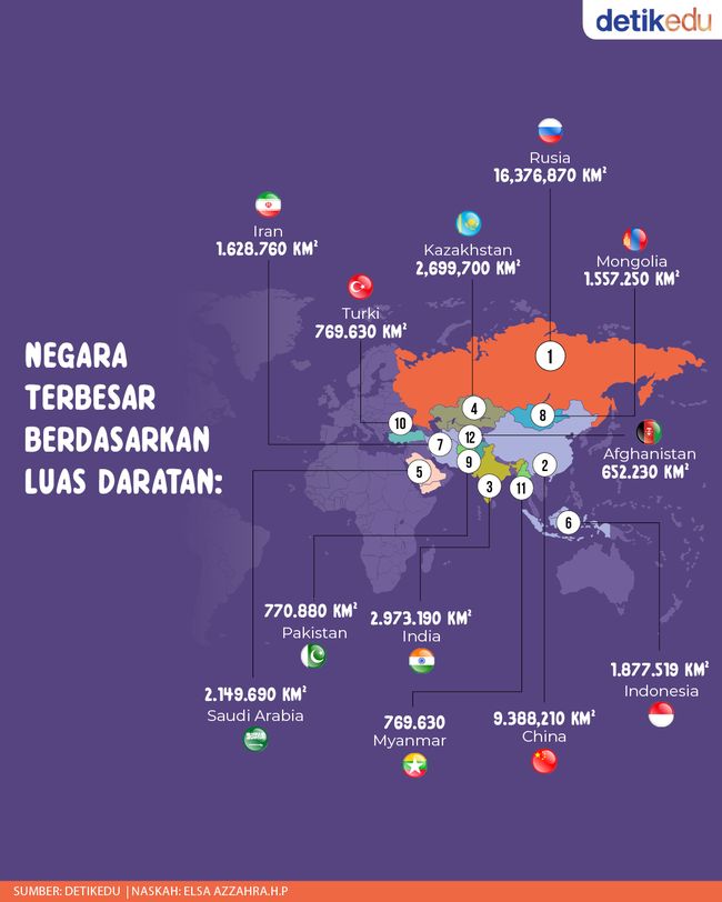 Jakarta - Negara apa saja yang menjadi terbesar di Asia dalam hal luas daratan dan penduduk? Indonesia masuk nggak ya? Simak infografisnya di sini yuk!
