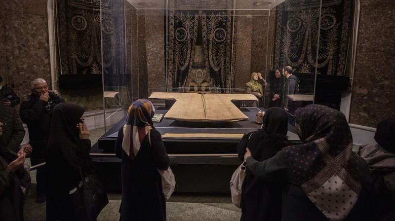 Orang-orang melihat jubah Nabi Muhammad, salah satu peninggalan suci penting yang diserahkan kepada Owais al-Qarani atas kehendak Nabi Muhammad di Istanbul, Turki, Senin (17/4/2023).