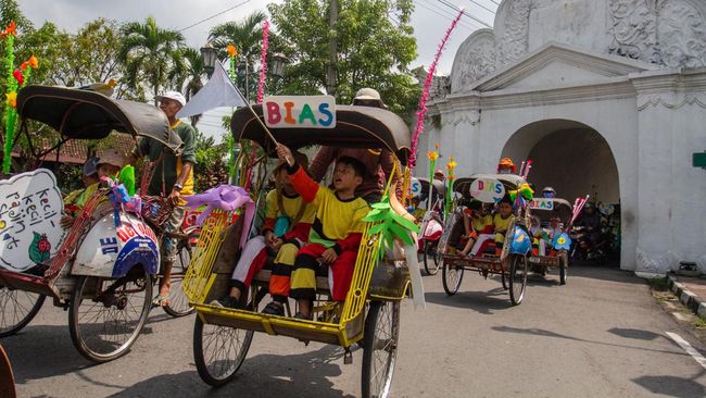 Siswa naik becak saat mengikuti pawai melintas di Plengkung Nirbaya, Yogyakarta, Selasa (2/5/2023). Pawai yang diikuti ratusan siswa dengan menaiki becak berkeliling Kota Yogyakarta tersebut dalam rangka memperingati Hari Pendidikan Nasional. ANTARA FOTO/Hendra Nurdiyansyah