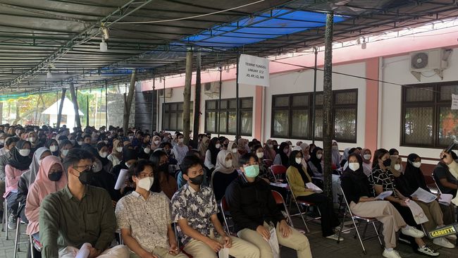 Sebelum memasuki ruangan, peserta duduk dan mendengarkan arahan dari petugas pelaksana UTBK-SNBT. Foto: Martha/detikEdu