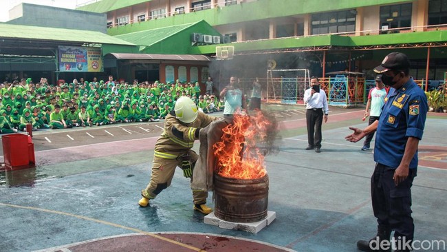 Tampak petugas Dinas Kebakaran menunjukkan cara memadamkan api di halaman TK-SD Al Azhar 4 Kebayoran Lama, Jl Ciputat Raya, Jakarta Selatan, Senin (12/6/2023).