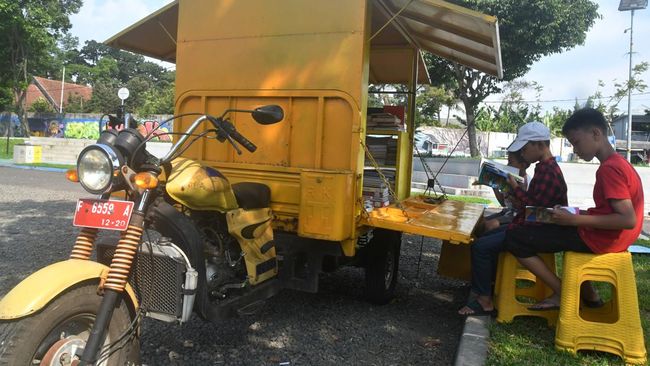 Bogor - Bekas sepeda motor sampah 'disulap' jadi perpustakaan keliling. Aksi itu dilakukan sebagai gerakan untuk meningkatkan literasi membaca di kalangan anak-anak.