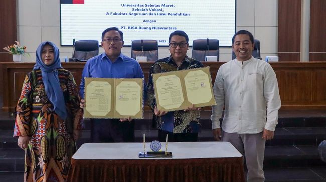 (Dari kiri ke kanan) Plt. Wakil Dekan Sumber Daya Manusia, Keuangan, dan Logistik Fakultas Keguruan dan Ilmu Pendidikan Universitas Sebelas Maret (UNS), Dr. Dewi Kusuma Wardani, M.Si; Direktur Utama PT BISA Ruang Nuswantara (BIRU), Kristiyanto Widiyawan; Plt. Wakil Rektor Perencanaan, Kerjasama, Bisnis dan Informasi UNS, Prof. Irwan Trinugroho, S.E., M.Sc., PhD; dan Plt. Wakil Dekan Perencanaan, Kerjasama, Bisnis dan Informasi Sekolah Vokasi UNS, Dr. Eng. Herman Saputro., S.Pd., M.Pd., M.T, dalam penandatanganan kerja sama BIRU dengan Sekolah Vokasi UNS dan FKIP UNS, di Aula Sekolah Vokasi UNS, Surakarta, Jumat (14/7). Kerja sama ini bertujuan mendorong praktik keberlanjutan melalui program pendidikan, penelitian dan pengembangan sumber daya manusia.