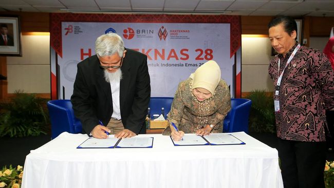 Direktur Water Resources, Sciences, and Process Technology Danone Indonesia Azwar Satrya Muhammad (kiri) bersama Kepala Pusyantek BRIN Dr. Yenni Bachtiar (tengah) melakukan penandatanganan peningkatan kerja sama untuk riset ilmiah pengukuran dampak penatalayanan air disaksikan Deputi Bidang Pemanfaatan Riset dan Inovasi BRIN DR. R. Hendrian, M.Sc pada acara Business Talk bertajuk “Kontribusi Talenta BRIN dalam Layanan Teknologi untuk Mendukung Pengembangan Bisnis, Peningkatan Daya Saing, dan Kemandirian Industri Nasional”, di Gedung B.J. Habibie, BRIN, Jakarta, Selasa (8/8/2023).