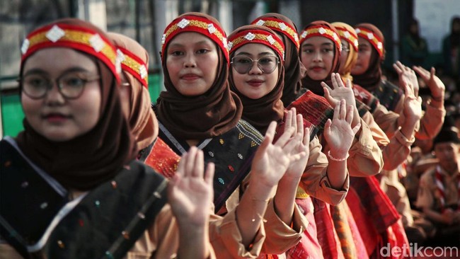 Sejumlah siswa menampilkan tarian untuk memeriahkan Hari Pramuka Nasional 2023 di MTS Jakarta Pusat, Senin (14/8/2023).