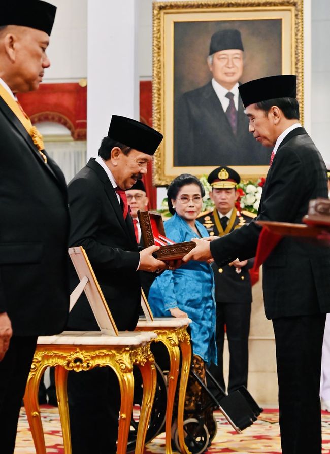 Presiden Joko Widodo memberikan gelar tanda kehormatan bagi tiga pahlawan budaya di Anugerah Kebudayaan Indonesia 2023 pada Senin (14/8).