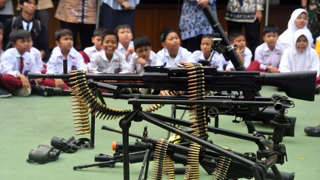 Bogor - Prajurit TNI AD menjelaskan tentang penggunaan senjata kepada sejumlah siswa SD di Makorem 061/Surya Kencana, Kota Bogor, Jawa Barat. Begini potret keseruannya.