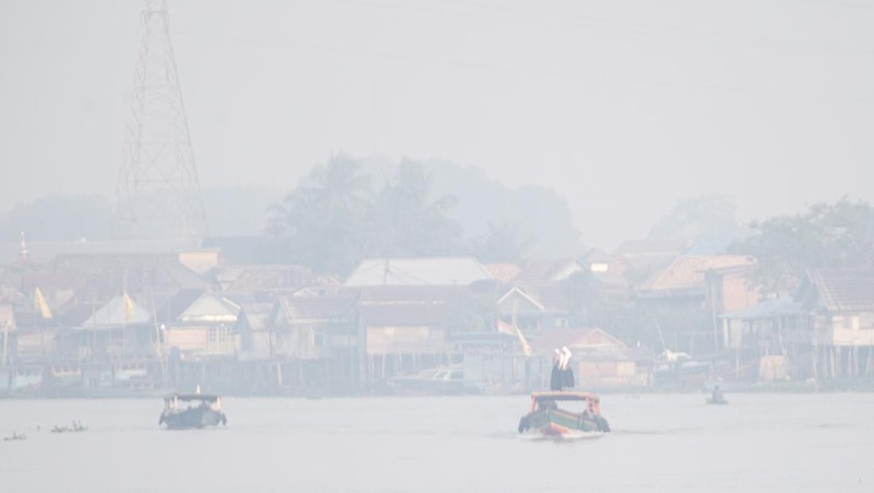 Sejumlah pelajar berangkat sekolah menggunakan perahu tradisional melewati kawasan yang diselimuti kabut asap di Sungai Ogan, Palembang, Sumatera Selatan, Rabu (6/9/2023).