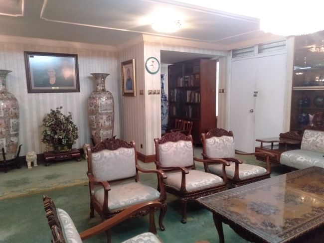 Ruangan utama dari rumah Soeharto dipenuhi oleh kursi- kursi antik yang terletak di beberapa sudut. Lukisan burung merpati hingga potret Soeharto dan istri menghias sekujur dinding di ruangan ini. Foto: Cicin Yulianti