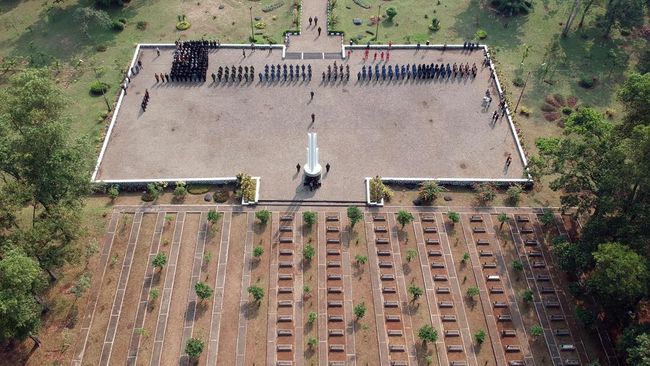 Foto udara pelaksanaan upacara sebelum ziarah di Makam Pahlawan Pondok Rajeg, Kabupaten Bogor, Jawa Barat, Kamis (9/11/2023).