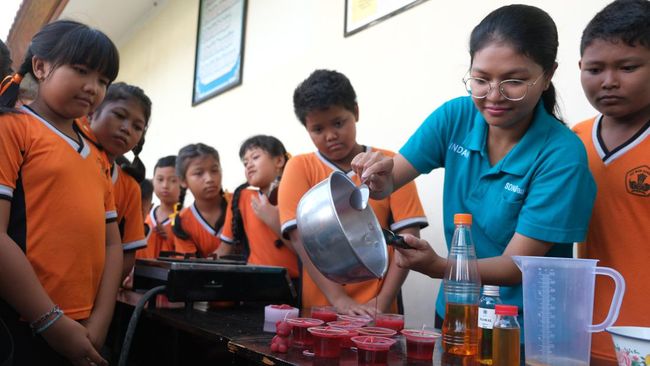 Bali - Siswa-siswi SD mempraktikkan cara membuat lilin dari limbah minyak jelantah. Kegiatan digelar untuk mendukung Proyek Penguatan Profil Pelajar Pancasila (P5).