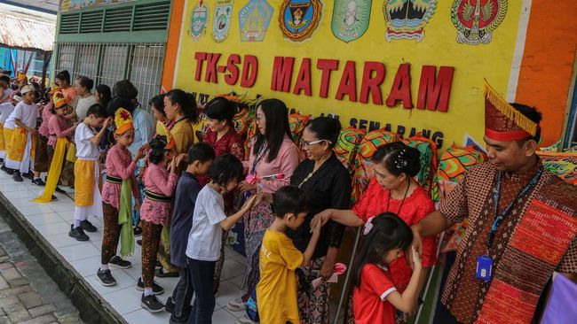Sejumlah siswa bersalaman dengan gurunya usai mengikuti festival gelar karya pelajar dan perayaan Hari Guru di TK-SD Mataram, Semarang, Jawa Tengah, Kamis (23/11/2023).