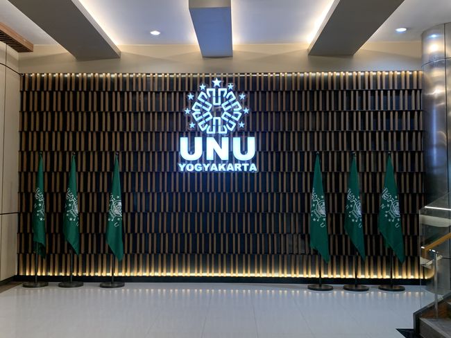 Lobi utama Kampus Terpadu UNU Yogyakarta yang berada di Jalan Ringroad Barat, Dowangan, Banyuraden, Gamping, Sleman, Yogyakarta. (Fahri Zulfikar/detikEdu)