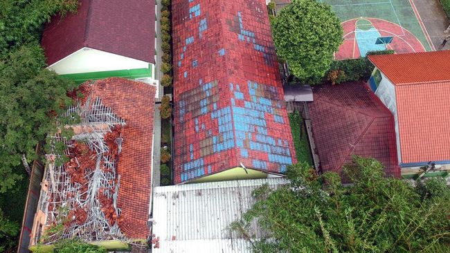 Foto udara atap dua ruangan kelas SMAN 1 Ciampea yang ambruk di Ciampea, Kabupaten Bogor, Jawa Barat, Jumat (15/3/2024).