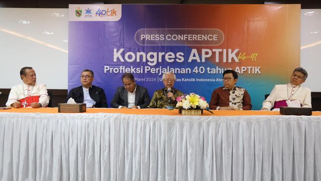 (Kiri ke kanan) Ignatius Kardinal Suharyo (Uskup Agung Jakarta), Yulius Yasinto (Wakil Ketua APTIK), Linus M Setiadi (Ketua Pengurus Yayasan Atma Jaya), Kusbiantoro (Ketua APTIK) Yuda Turana (Rektor Universitas Katolik Indonesia Atma Jaya), Antonius Subianto Bunjamin ( Ketua KWI) saat Konferensi Pers terkait Kongres Asosiasi Perguruan Tinggi Katolik (APTIK) ke 41 di Kampus Semanggi Unika Atma Jaya, Jakarta (22/3/2024).