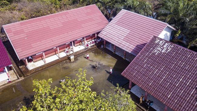 Foto udara SDN 34 Sungai Bungur di Muaro Jambi, Jambi, Senin (25/3/2024). Saat ini banjir yang merendam ruang kelas sudah surut. Hanya halaman sekolah yang masih tergenang.