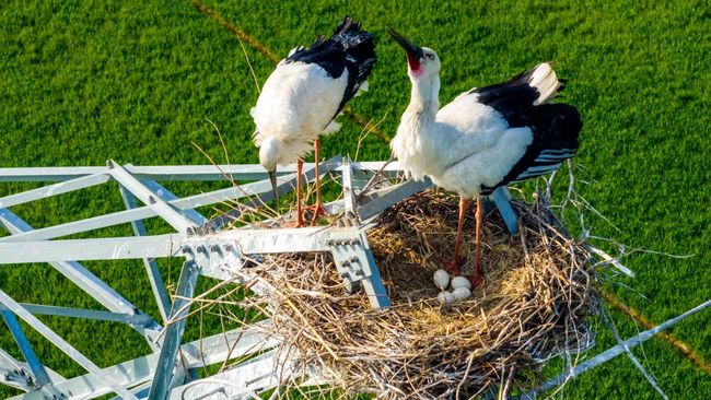 Huai'an - Sepasang bangau putih oriental tertangkap membuat sarang di tower SUTET! Mereka mengerami telurnya hingga menetas di situ.