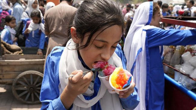 Siswa di Pakistan Ngemil Es Serut Ditengah Panasnya Cuaca