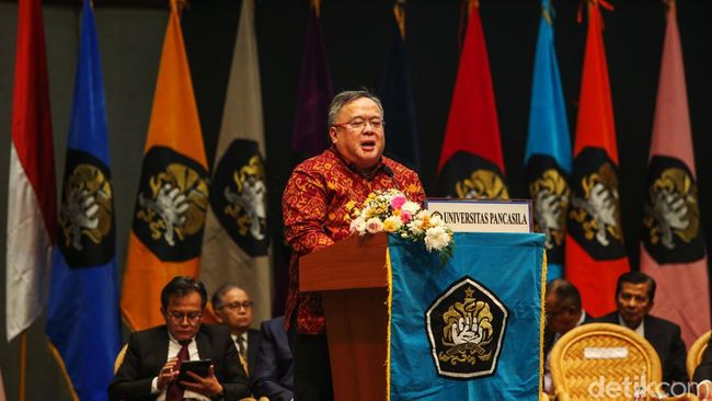 Jakarta - Universitas Pancasila menggelar acara wisuda di JCC, Jakarta, Selasa (21/5/2024). Acara wisuda itu dihadiri oleh mantan Menristek Bambang Brodjonegoro.