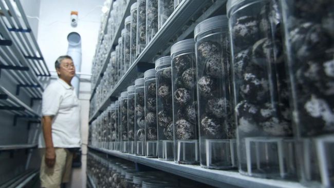 Founder Banyuwangi sea Tuttle Foundation (BSTF) Wiyanto Haditanojo mengecek telur penyu yang ditetaskan di dalam inkubasi buatan (Intan) ruang di Banyuwangi, Jawa Timur, Jumat (14/06/2024).