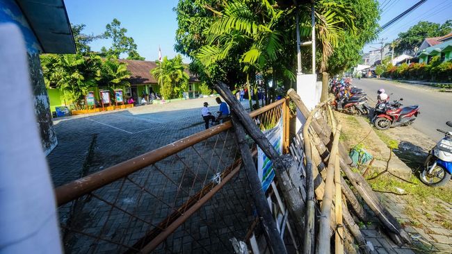 Kondisi gerbang sekolah yang ditutup dengan tumpukan kayu di SD Negeri Kuranji, Kota Serang, Banten, Selasa (16/7/2024).