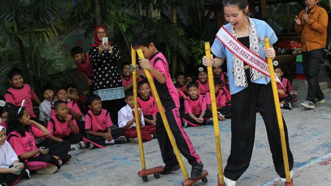 Putri Anak Indonesia Budaya 2022 Karina Aliya Afandi (kedua dari kanan) bersama seorang siswa bermain permainan tradisional egrang di SD Negeri Airlangga I, Surabaya, Jawa Timur, Senin (22/7/2024).