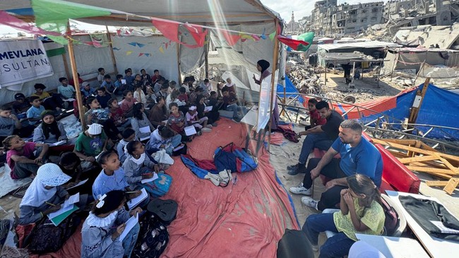 Khan Younis - Sekolah-sekolah di Jalur Gaza hancur lebur dibombardir Israel. Meski begitu, anak-anak Palestina tetap semangat belajar di sekolah darurat.