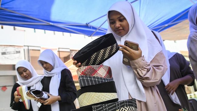 Sejumlah siswa melihat peci bambu dan sepatu bambu di SMAN 15 Kabupaten Tangerang, Banten, Selasa (22/10/2024).