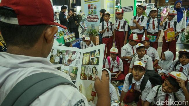 Jakarta - Anak-anak dari sekolah dasar mengikuti pameran bulan bahasa dan sastra di Gedung Mendikdasmen, Jakarta. Mereka tampak antusias saat mengikuti kegiatan tersebut.