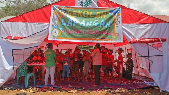Nusa Tenggara Timur - Erupsi Gunung Lewotobi Laki-laki membuat siswa SD terpaksa belajar di luar sekolah. Mereka belajar di posko pengungsian Desa Lewolaga, Flores Timur, NTT.