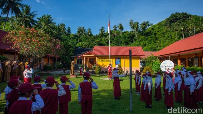Sejumlah siswa melakukan upacara bendera di SDN 005 Lembah Rewak, Jemaja, Anambas, Senin (4/11/2024).