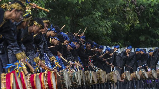 Sejumlah pelajar menampilkan kesenian Rampak Bedug sebagai pengiring tarian Walijamaliha saat Harvesting Bangga Buatan Indonesia (BBI) dan Bangga Berwisata di Indonesia (BBWI) Tingkat Provinsi di lapangan kantor Gubernur Banten, Kota Serang, Banten, Rabu (11/12/2024).